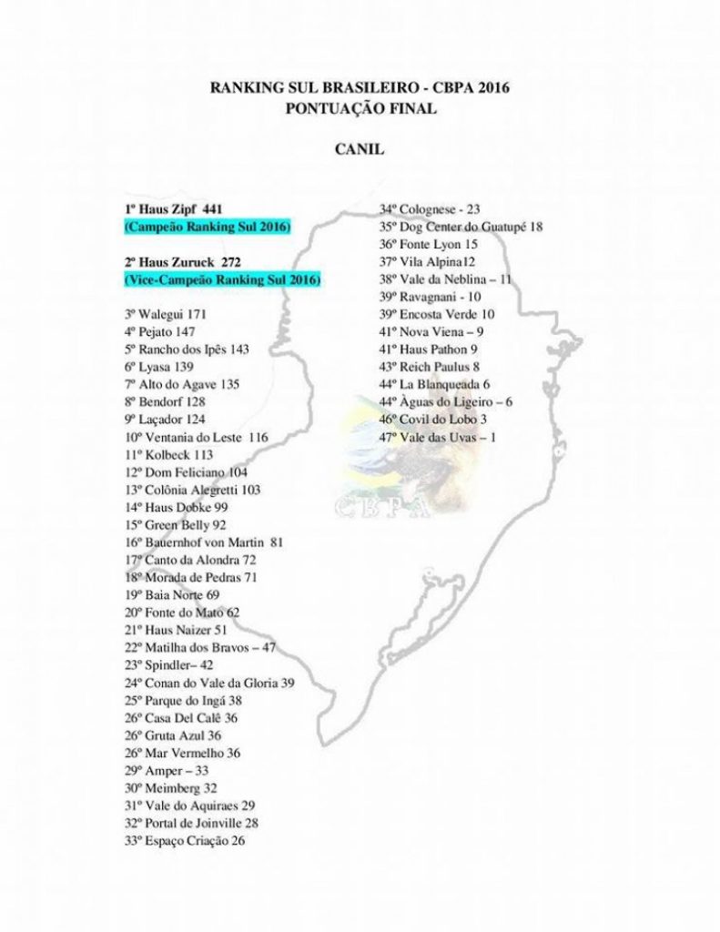 Orgulhosamente comunicamos a todos que o Canil von Haus Zipf conquistou o título de melhor canil do sul do Brasil (PR, SC e RS) ao vencer de ponta a ponta o ranking sul brasileiro da raça CBPA 2016, disputado em 5 etapas ao longo deste ano. Muito obrigado a todos amigos pela torcida !!